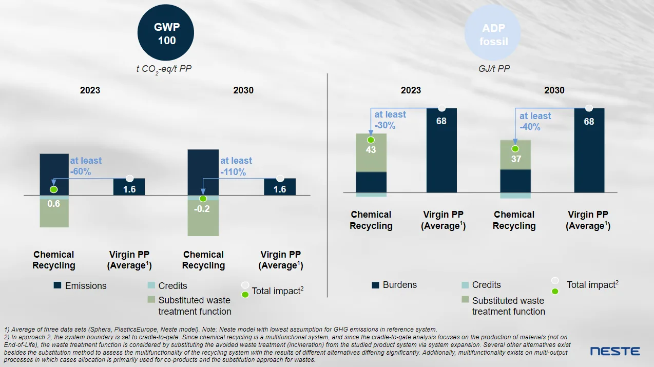 Der CO2-Handabdruck von Polypropylen, das aus chemisch recyceltem Kunststoffabfall hergestellt wird, beträgt etwa 1 Tonne CO2-Äquivalent pro produzierter Tonne Polypropylen, was einer Verkleinerung des CO2-Fußabdrucks um 28 % gegenüber dem derzeitigen Szenario entspricht. Der Verbrauch fossiler Ressourcen könnte um 66 % bzw. 25 Gigajoule pro Tonne reduziert werden. Der CO2-Handabdruck von petrochemischen Rohstoffen, die aus chemisch recyceltem Kunststoffabfall hergestellt werden, beträgt etwa 0,9 Tonnen CO2-Äquivalent pro produzierter Tonne Polypropylen, was einer Verringerung des CO2-Fußabdrucks um 39 % gegenüber dem derzeitigen Szenario entspricht. Der Verbrauch fossiler Ressourcen könnte um 72 % bzw. 19 Gigajoule pro Tonne reduziert werden.