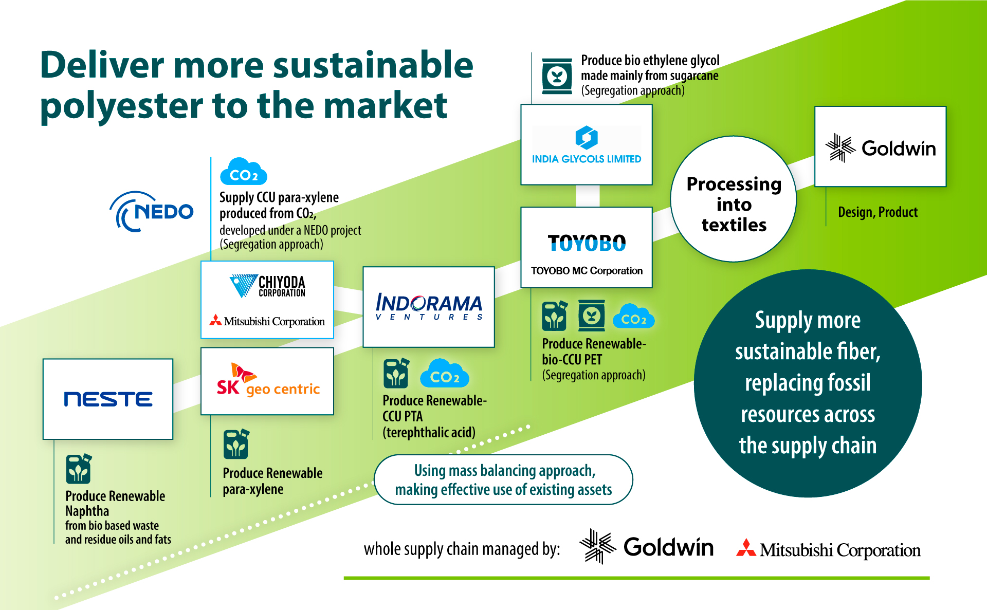 Ein Konsortium von sieben Unternehmen aus fünf Ländern hat gemeinsam eine Lieferkette für nachhaltigere Polyesterfasern aufgestellt: Anstelle von fossilen Rohstoffen werden bei der Herstellung von Polyesterfasern für die Marke The North Face in Japan erneuerbare und biobasierte Materialien sowie CO2 (über Carbon Capture and Usage, CCU*) eingesetzt. An dem Projekt beteiligt sind Goldwin als Projektträger, Mitsubishi Corporation, Chiyoda Corporation (alle drei aus Japan), SK geo centric (Südkorea), Indorama Ventures (Thailand), India Glycols (Indien) und Neste.