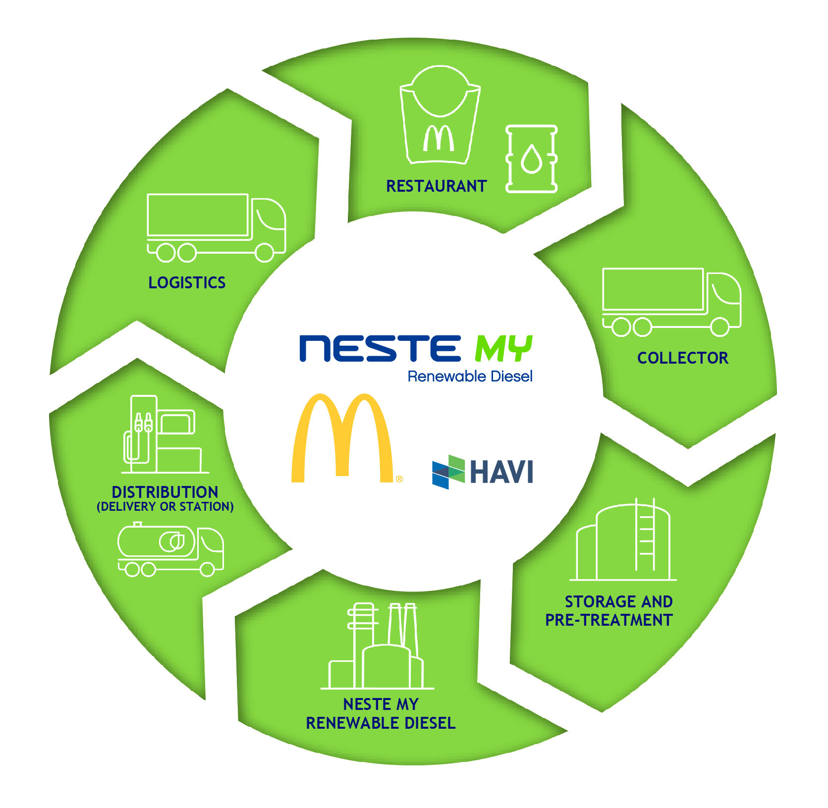 In der Partnerschaft für Kreislaufwirtschaft spielt HAVI, der Lieferkettenpartner von McDonald‘s, eine zentrale Rolle, da das Unternehmen das gebrauchte Speiseöl aus allen 252 niederländischen McDonald’s Restaurants aufkauft. Neste wandelt dieses gebrauchte Speiseöl dann in seiner Raffinerie in Rotterdam in erneuerbaren Diesel um, mit dem die Lastwagen von HAVI betankt werden.