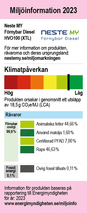 Miljömärkningen innebär, att Neste, i enlighet med Miljöföreskriften, informerar på denna sida, samt även på drivmedelspumpen (i form av en dekal) vad Neste MY Förnybar Diesel består av, samt ursprungslandet för råvarorna. Siffrorna baseras på fjolårets (dvs år 2022) råvarumix och uppdateras på årlig basis. (Detta år synliggör fjolårets innehåll - år 2023 kommer reflektera år 2022 innehåll och så vidare).