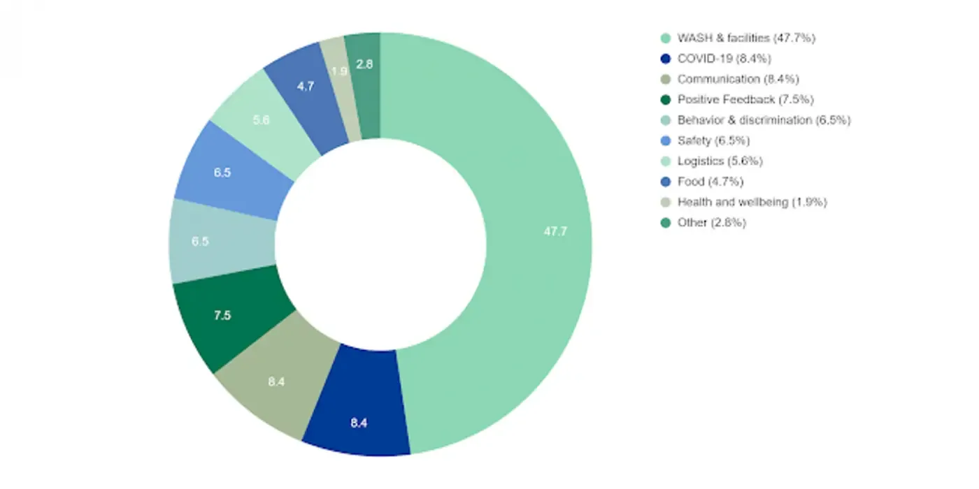 In addition to the suggestion boxes, we also promote the use of Neste’s global whistleblowing channel, Ethics Online, which is made accessible to workers via web, phone and QR codes posted at various locations on site. Workers are also encouraged to raise concerns to their supervisors via email, phone or in-person, if they wish. As of December 2021, we had received a total of 107 submissions via the grievance channels promoted on site, with the majority of these (95%) made via the suggestion boxes. Suggestion box submissions received included local complaints, as well as positive feedback. A summary of the type of complaints received, arranged by topic, is available in the chart below.