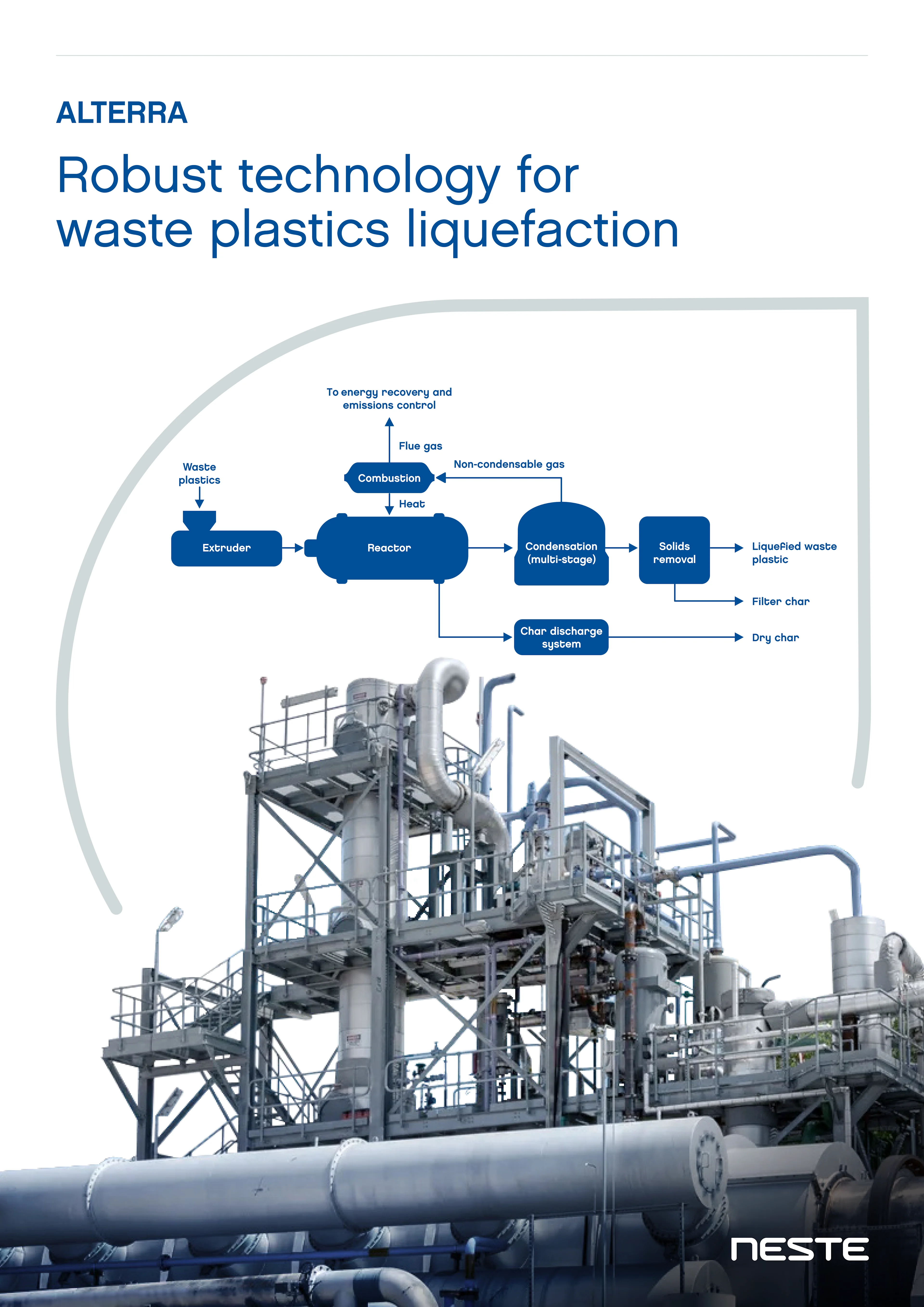 Alterra process efficiently breaks down the long hydrocarbon chains in plastics into short hydrocarbons, which are then condensed into a circular oil for use in oil refining or petrochemical processes. The technology is commercially proven in a continuously operated reference plant by Alterra in Akron, Ohio, USA. This demonstrates its technical robustness as well as its long term reliability in industrial conditions.